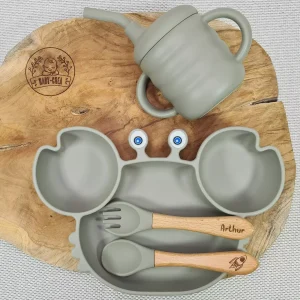 Coffret repas bébé personnalisé – Assiette crabe silicone et prénom gravé