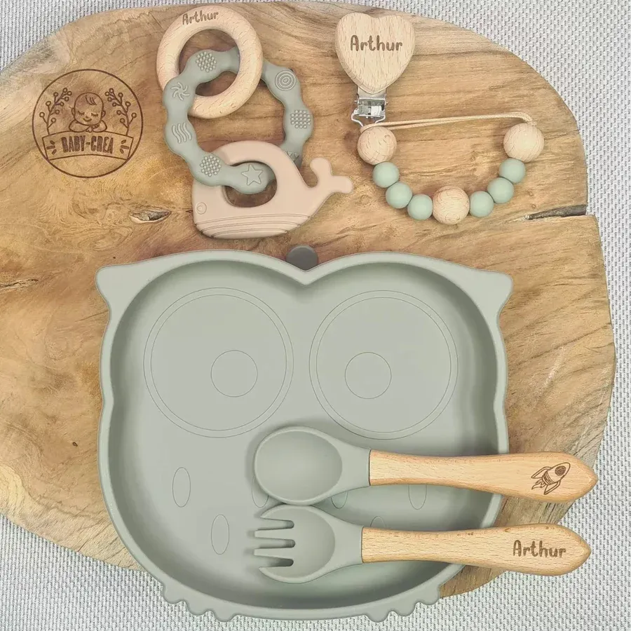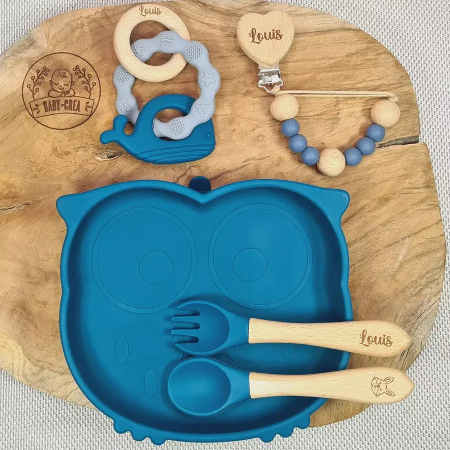 Coffret Bébé Personnalisé – Assiette Hibou, Attache Tétine & Anneau Dauphin