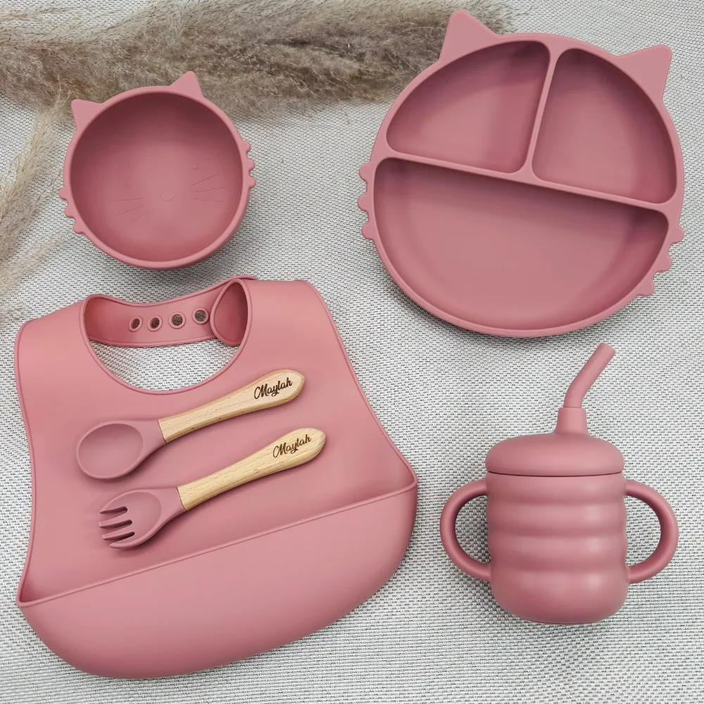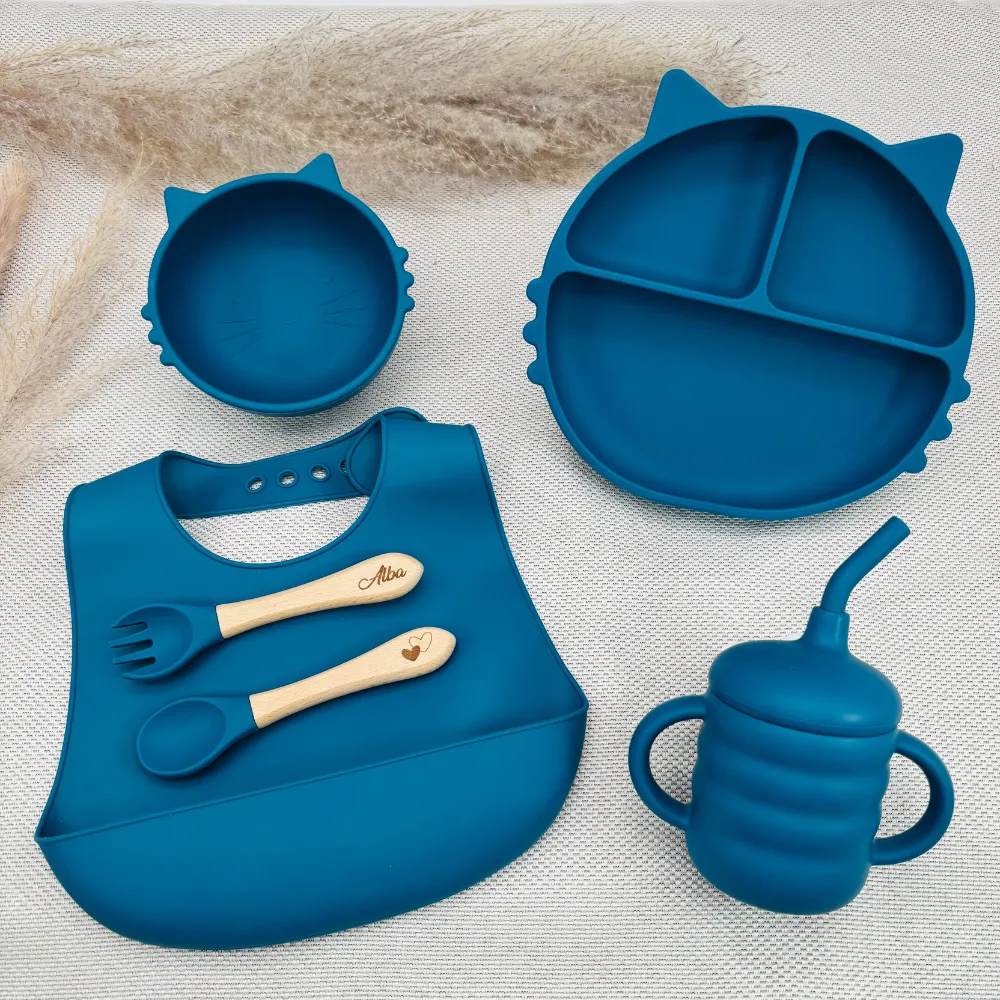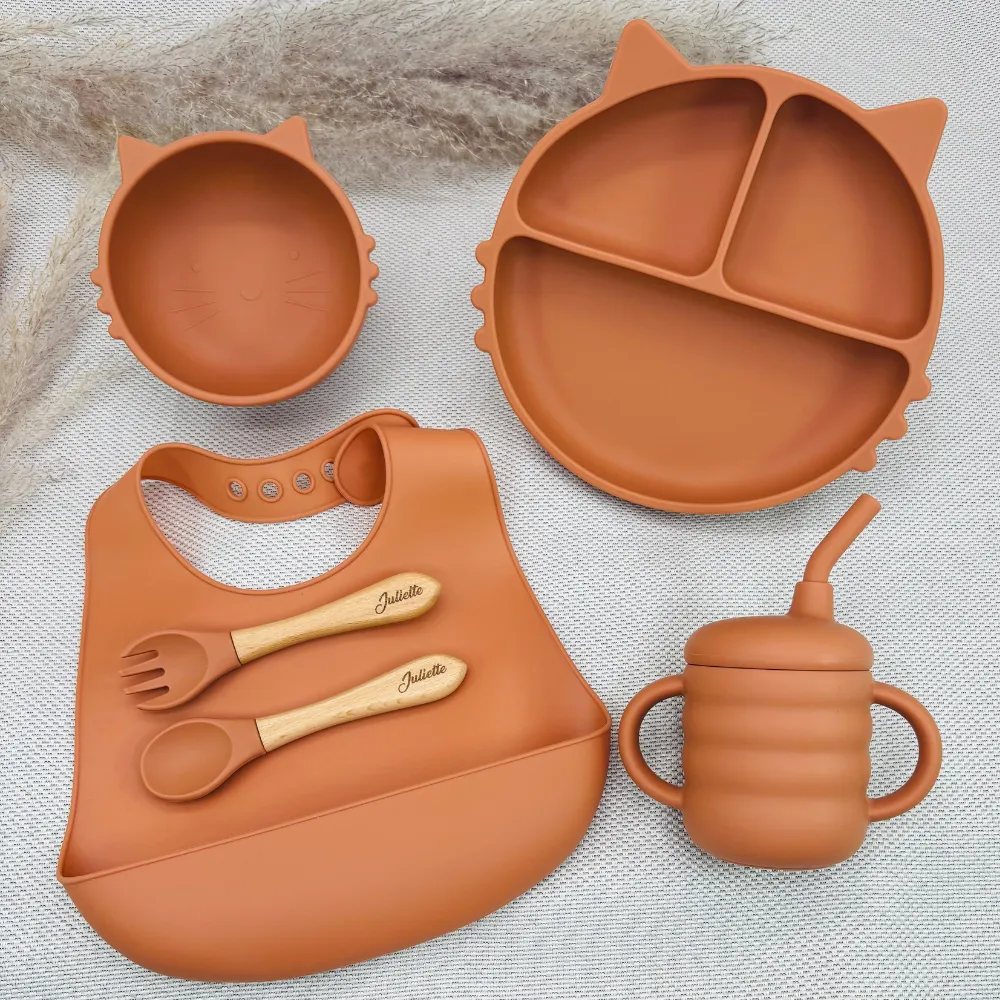 Coffret Repas Bébé Personnalisé – Assiette Chat, Bol, Tasse, Bavoir & Couverts