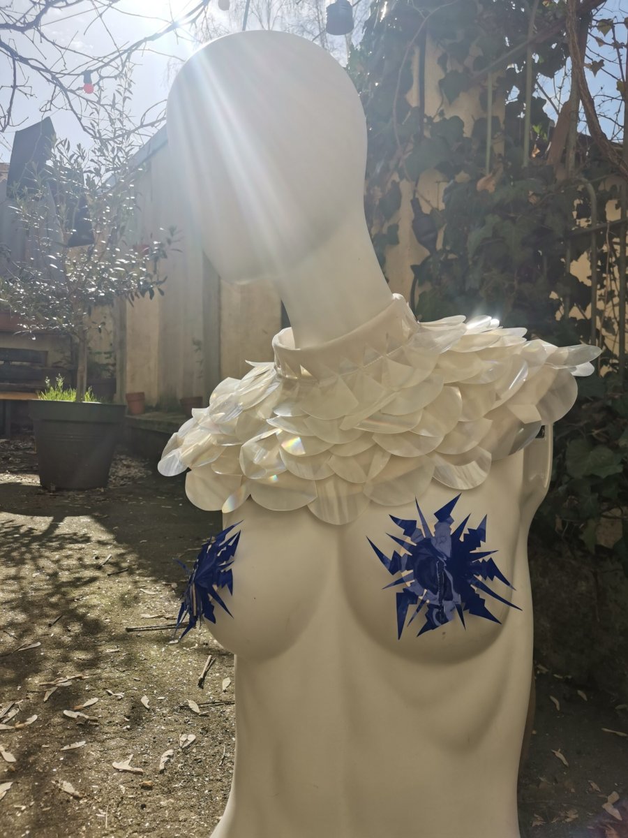 Col écaille réalisé à partir de chutes de simili cuir doré et Alcantara.