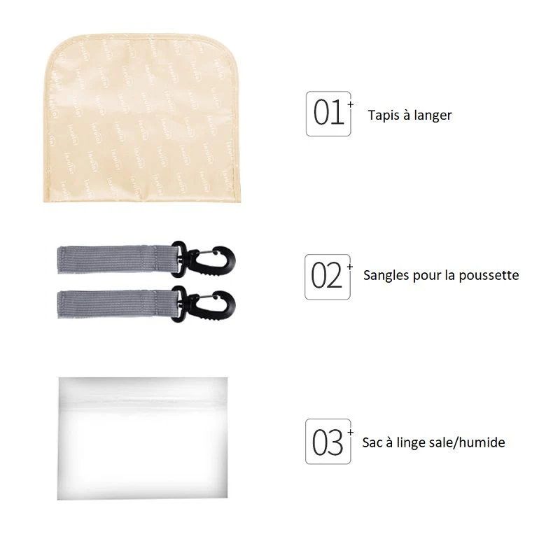 - Accessoires inclus : Tapis à langer, sangles pour la poussette, sac de linge sale/humide