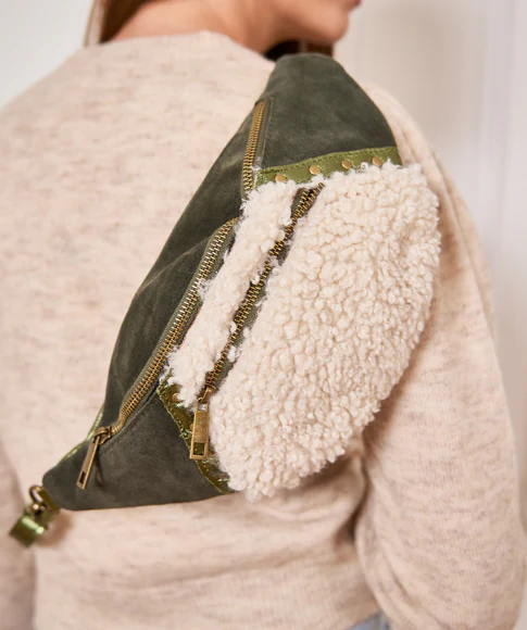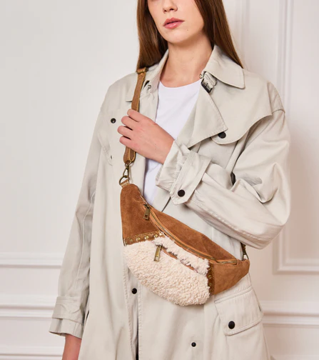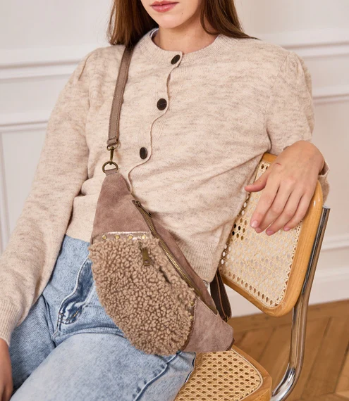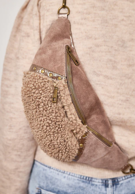 Cette banane mixe cuir retourné, cuir irisé, détails en laiton doré ET MOUMOUTE !